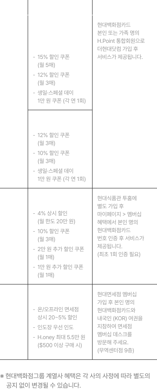 ※ 현대백화점그룹 계열사 혜택은 각 사의 사정에 따라 별도의 공지 없이 변경될 수 있습니다.