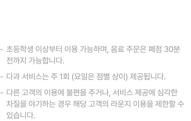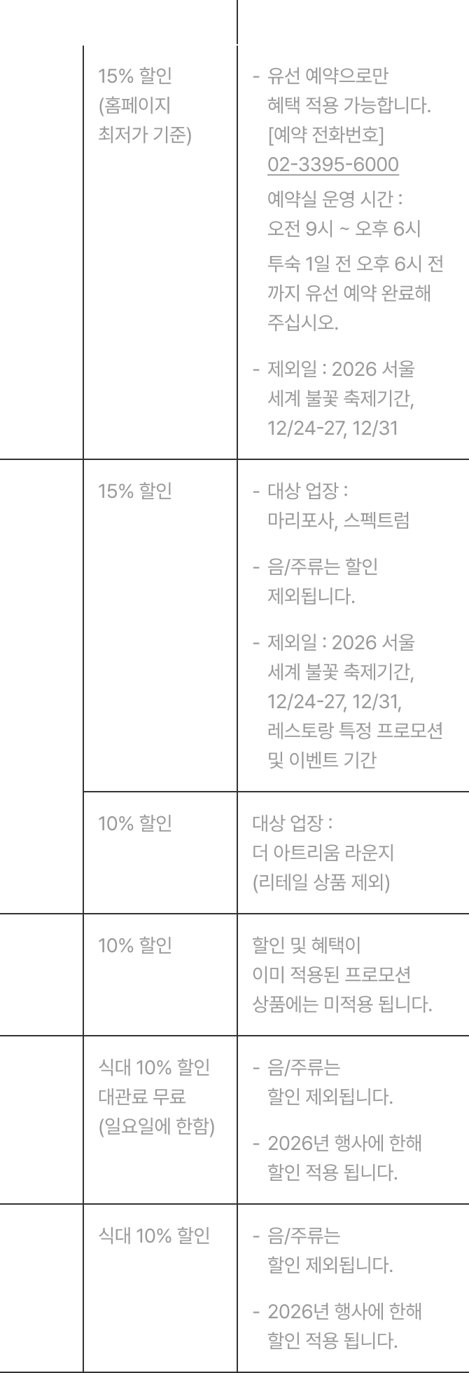 - 대상 업장 : 마리포사, 스펙트럼 - 음/주류는 할인 제외됩니다. - 제외일 : 2026 서울 세계 불꽃 축제기간, 12/24-27, 12/31, 레스토랑 특정 프로모션 및 이벤트 기간 |