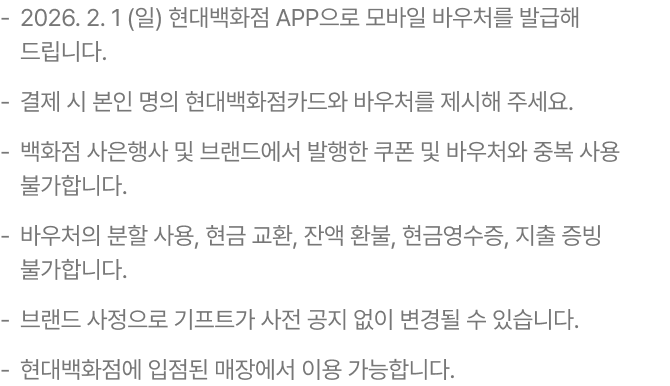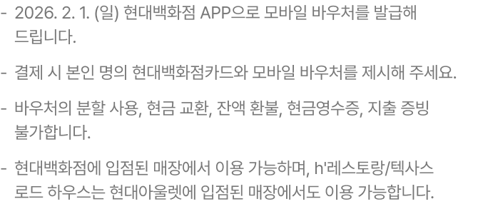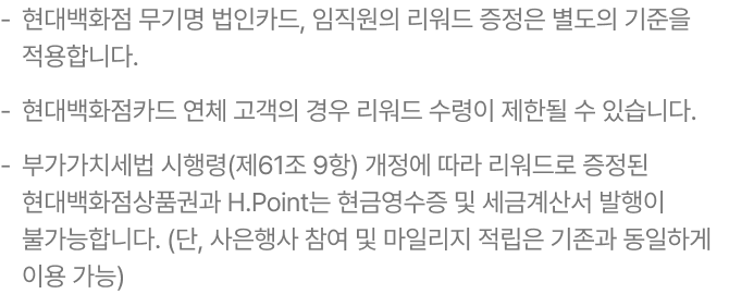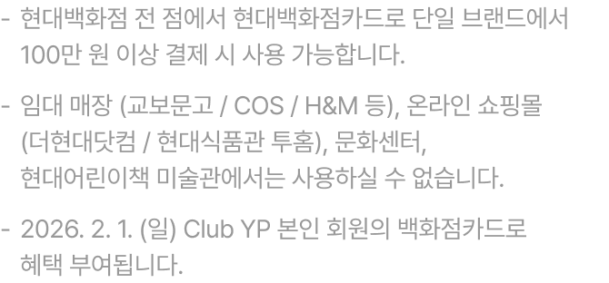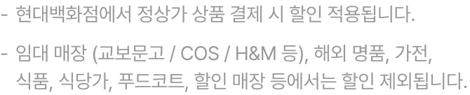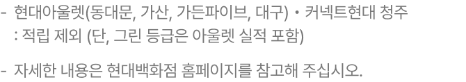 | 더현대닷컴 • 현대식품관 투홈 | 현대백화점카드 | 100% 반영 |