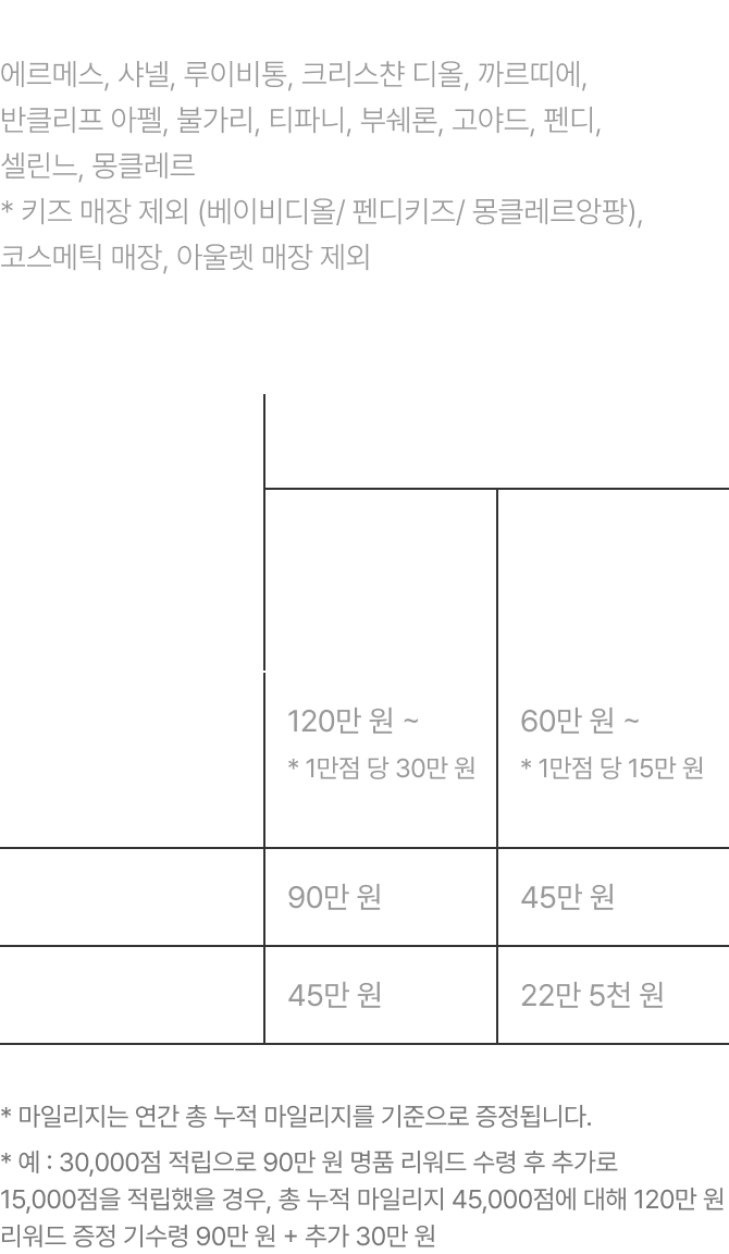 * 예 : 30,000점 적립으로 90만 원 명품 리워드 수령 후 추가로 15,000점을 적립했을 경우, 총 누적 마일리지 45,000점에 대해 120만 원 리워드 증정 (기수령 90만 원 + 추가 30만 원)