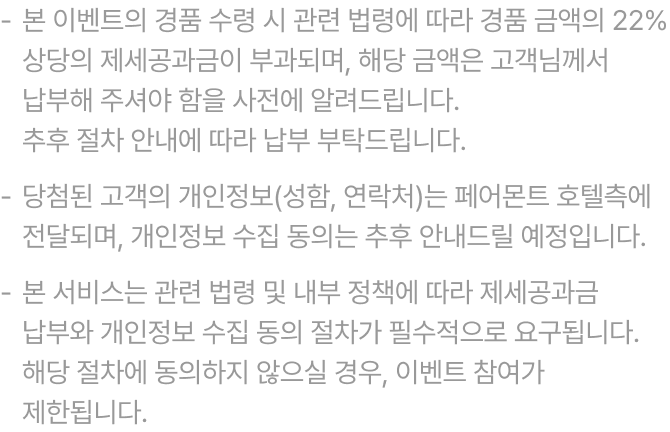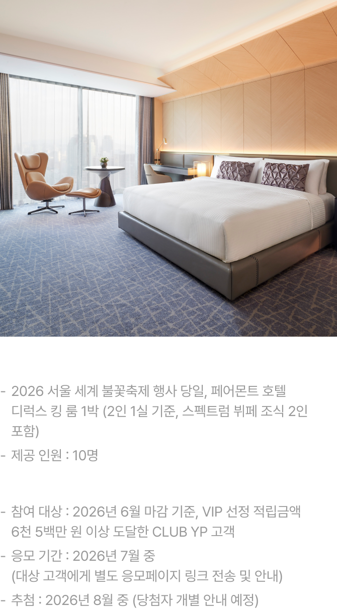 - 유선 예약으로만 혜택 적용 가능합니다. [예약 전화번호] 02-3395-6000 예약실 운영 시간 : 오전 9시 ~ 오후 6시 투숙 1일 전 오후 6시 전까지 유선 예약 완료해 주십시오. - 제외일 : 2026 서울 세계 불꽃 축제기간, 12/24-27, 12/31 |
